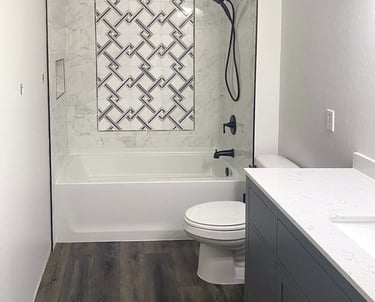 The original fiberglass surround and bathtub were removed to make way for a custom tile installation, featuring a clean layout and a detailed accent design. New LVP flooring and an updated vanity completed the transformation.