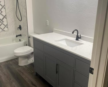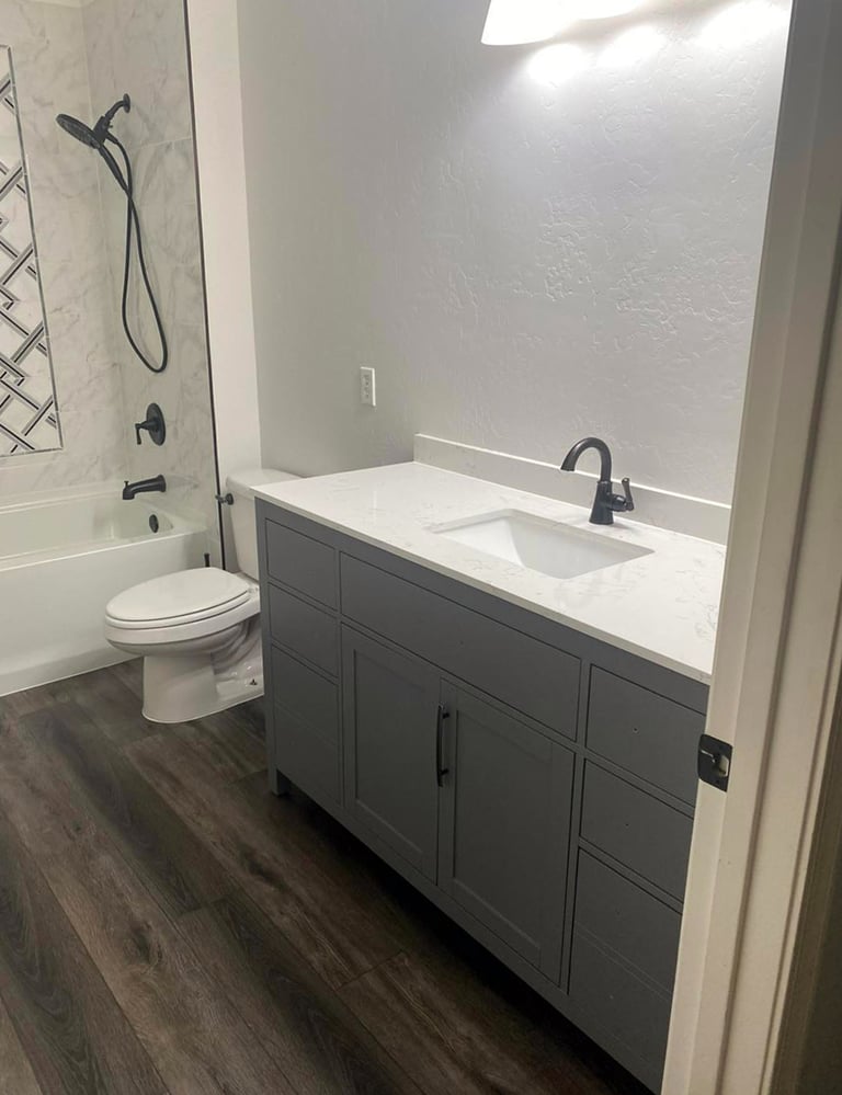 This bathroom remodel in Phoenix included a full tub surround tile installation, updated flooring, and a new vanity for a clean, modern finish. The project transformed an outdated bathroom into a more functional and visually refined space.